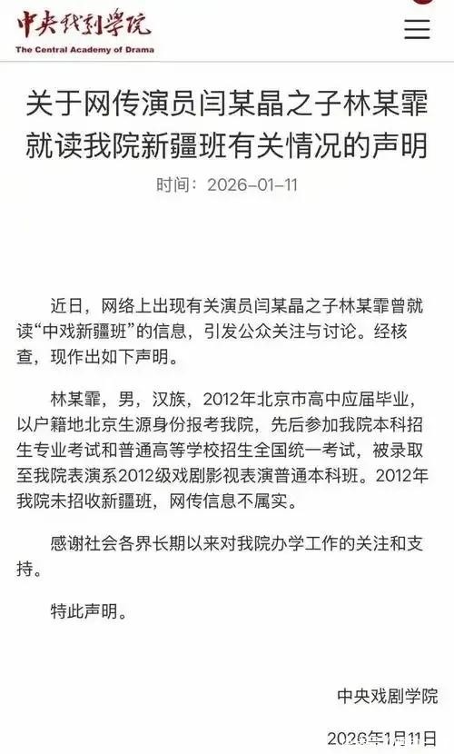 终于在舆论的压力下,中戏发布了一则简短的声明,说林傲霏参加艺考的那年,中戏并没有设立新疆班,另外林傲霏就是通过普通高考考进中戏表演班的。